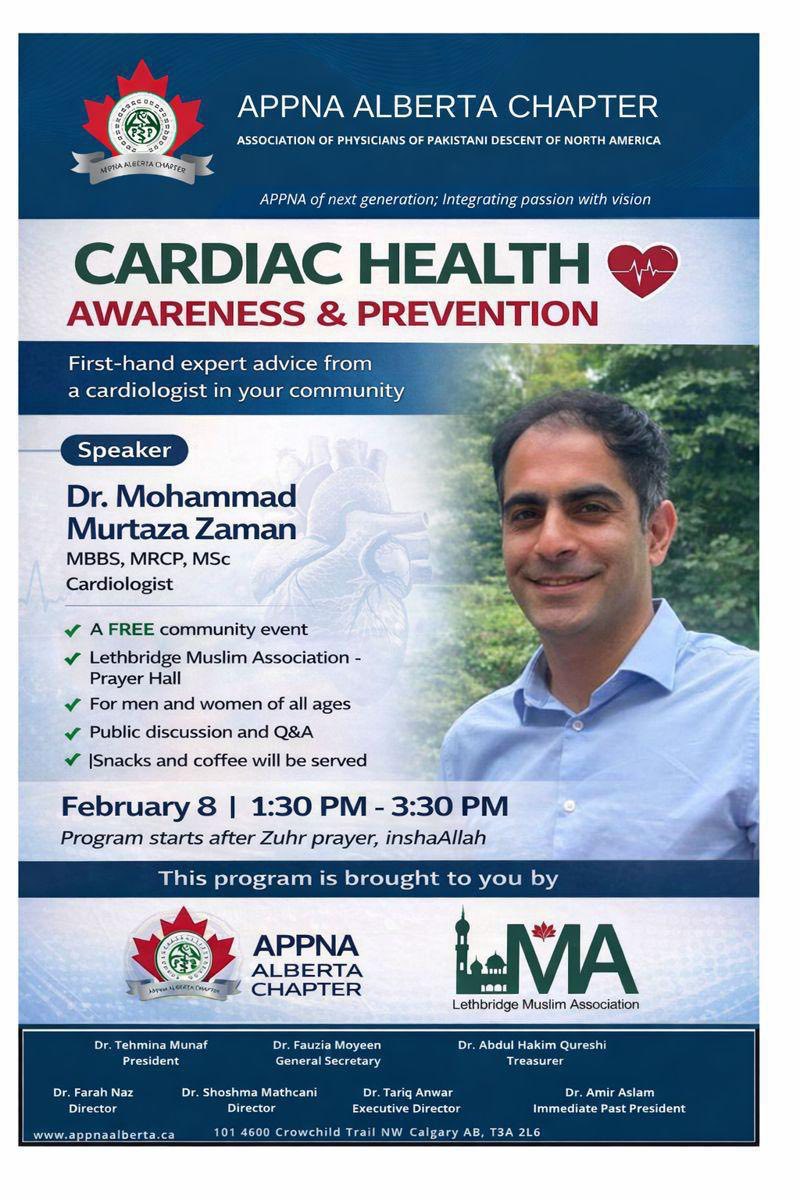 APPNA Alberta Chapter hosted a well-attended community awareness program in Lethbridge on 8 February 2026, bringing together community members and local leaders. The session featured an engaging and interactive talk by Dr. Murtaza Zaman, Cardiologist at Chinook Regional Hospital.